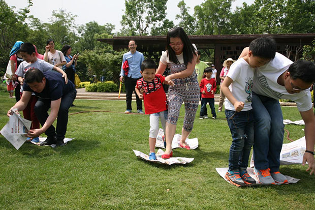 不要停留脚步,跟着呼唤声往里走,原来大家在“伊甸园”热火朝天的做“铺报纸”的游戏呢?一个大人一个宝宝,配合协调的一步步往前走……